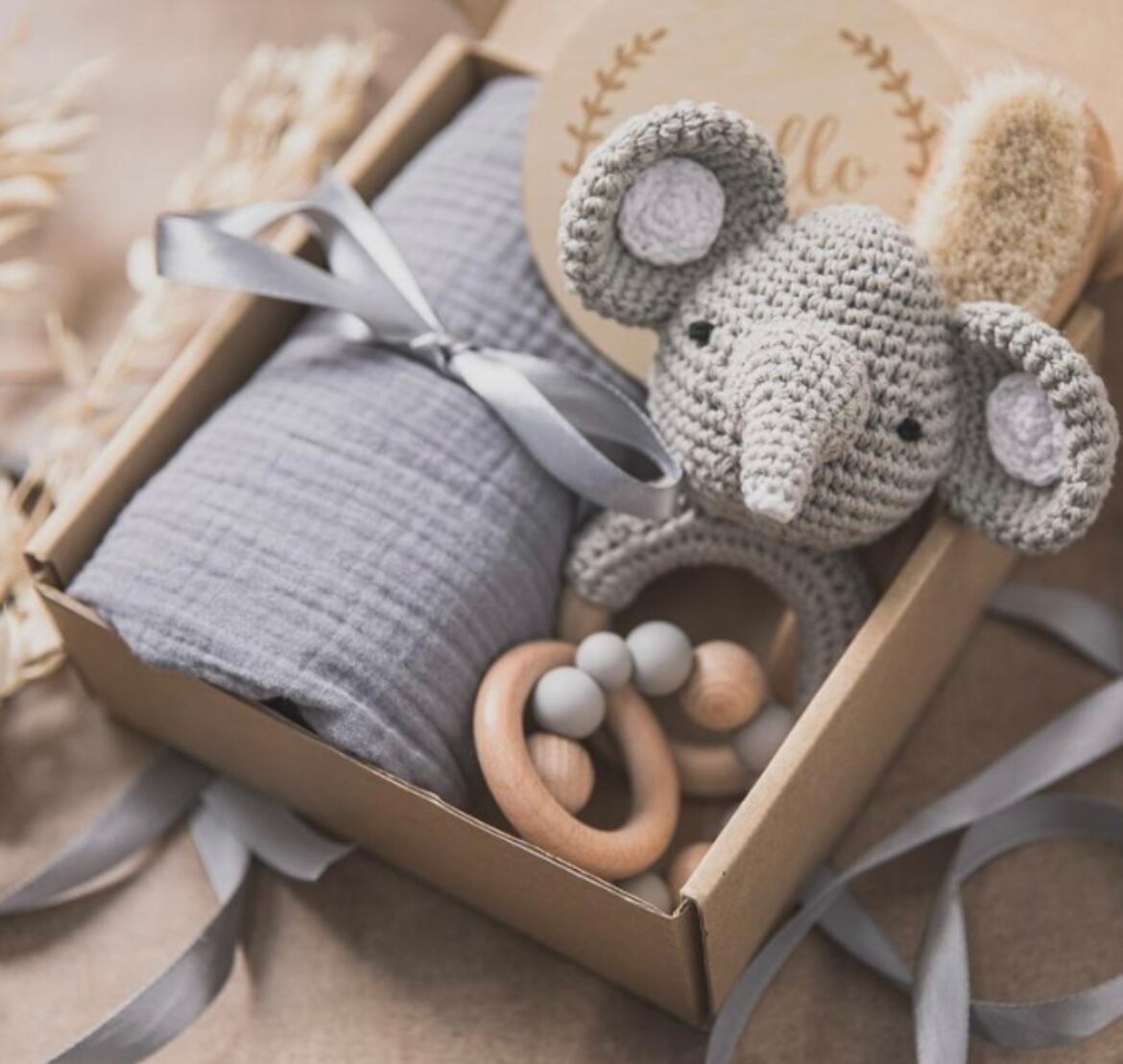 ブランケット、ゾウのラトル、歯固めのセットです♪