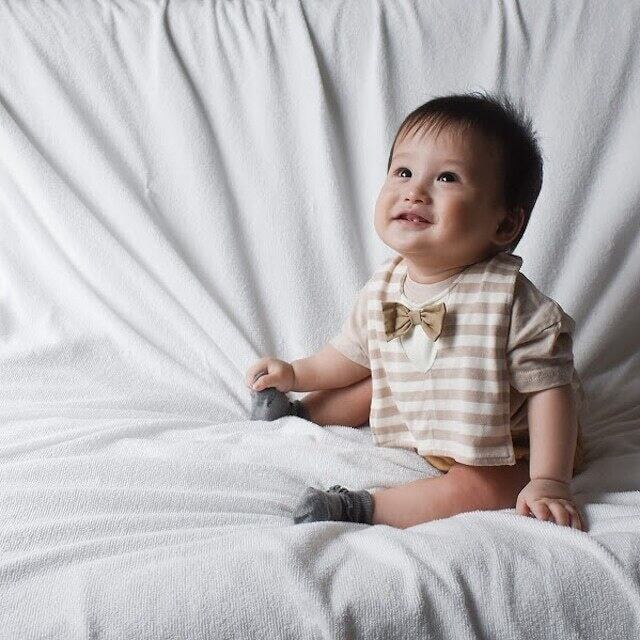 お食い初め(100日祝い)などの記念日をはじめ、結婚式などのお呼ばれシーンにもぴったりのフォーマルベストスタイ。